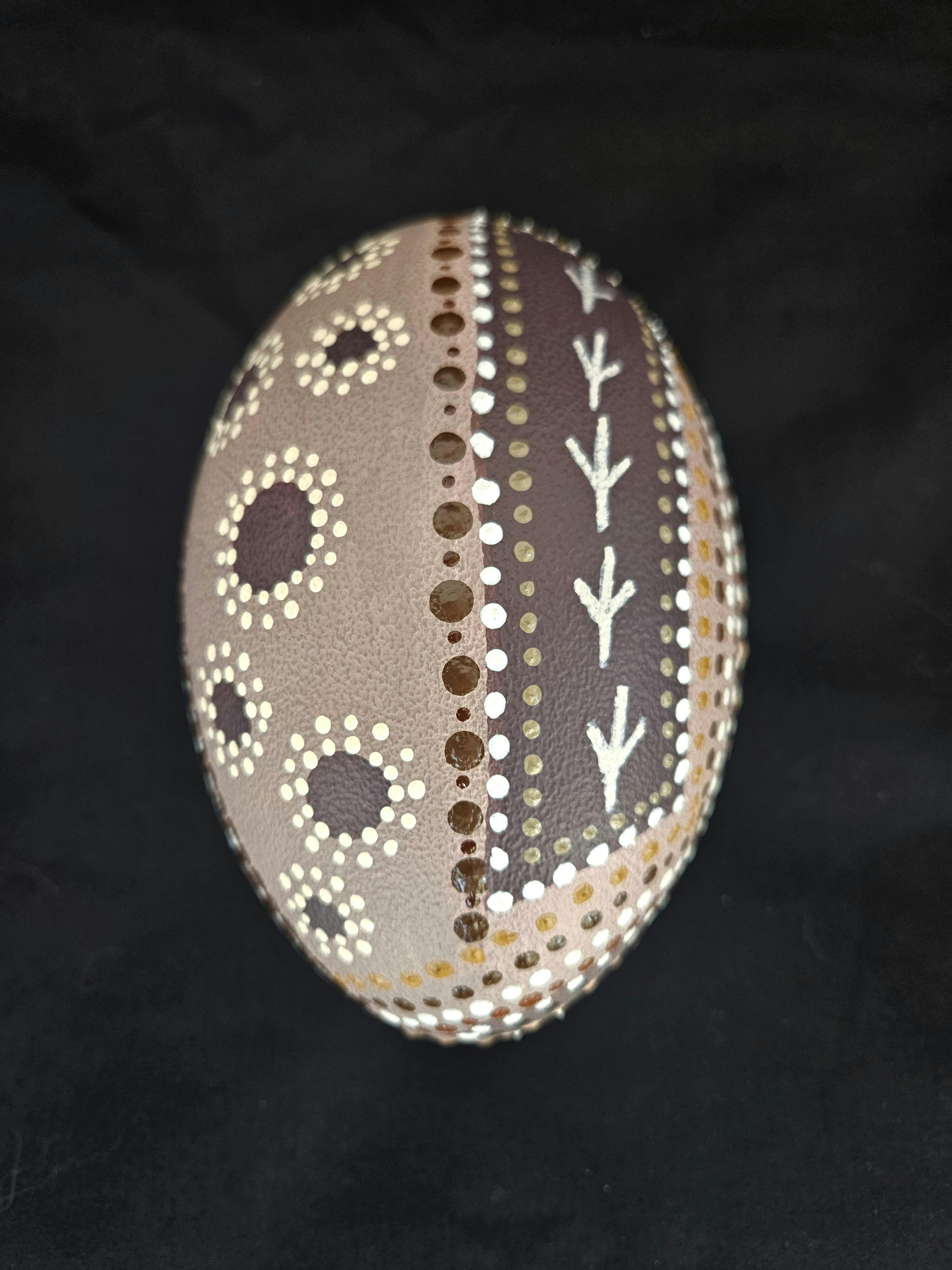 Our Emu Eggs are all blown by hand by the team here at Emu Logic. This is done through one hole in the bottom end of the egg (approx 7mm hole). After the hole is drilled the yoke is mushed up with a bit of wire then it is pushed out the same hole with a bike pump. After the contents are removed all eggs have disinfectant sprayed into them before being shaken to clean all the leftover remnants of egg. Please note all eggs also contain the last 3 digits of our licence number written on the base as per our licence requirements.